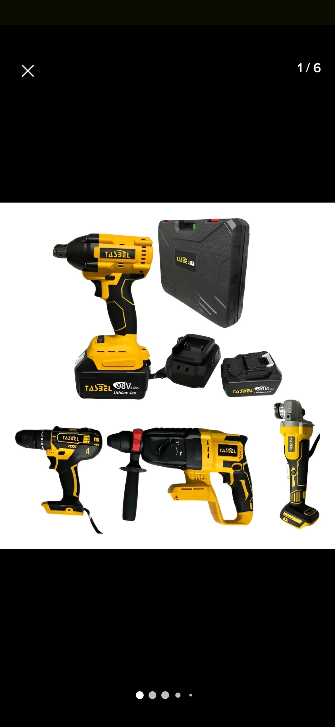 Descripción Kit Herramientas Inàlambrica x4 el juego de màquina especial para ti, realiza diferentes trabajos domesticos o en tu taller con estas herramientas que te ayudaran hacer mas facil los trabajos. Herramienta eléctrica con batería de litio 98 v, Juego de 4 piezas 01 esmeril angular, 1 taladro eléctrico, 1 martillo eletrico , 1 llave de impacto incluye 2 baterias y 1 cargador. 1 Taladro : Max. Diámetro: 10mm , Tiempo de carga: 2 horas, 0/450- 0/1700r/MIN 1 llave de impacto: 0-1600/0-2100/0-2800 r/min 1 esmeril angular: Diámetro del agujero:16mm, max.diametro 125mm, velocidad nominal 10000r/min. 1 martillo eléctrico: frecuencia de impacto 0-3000r/min diamentro 26mm velocidad 0-1200/min Incluye maleta de guardado